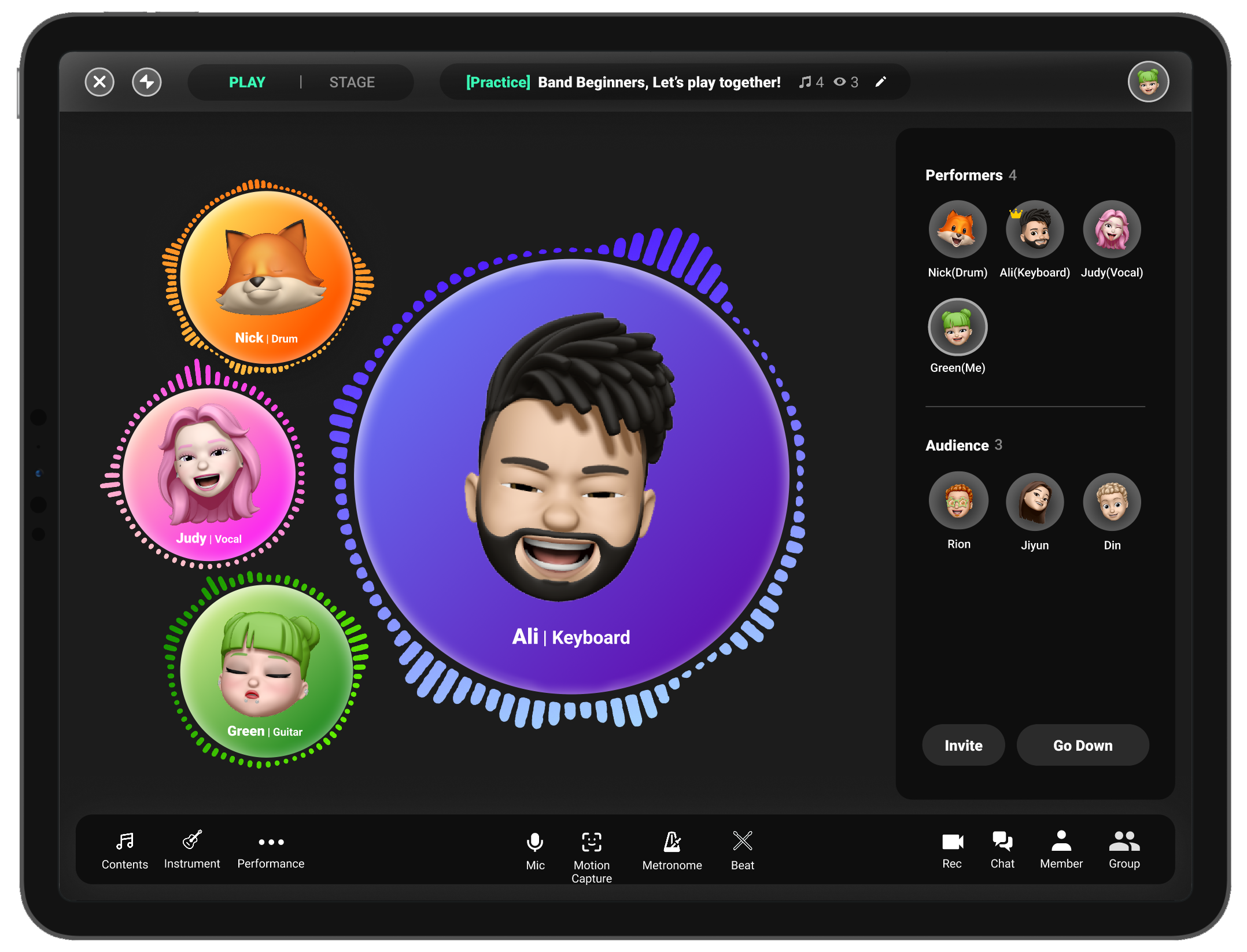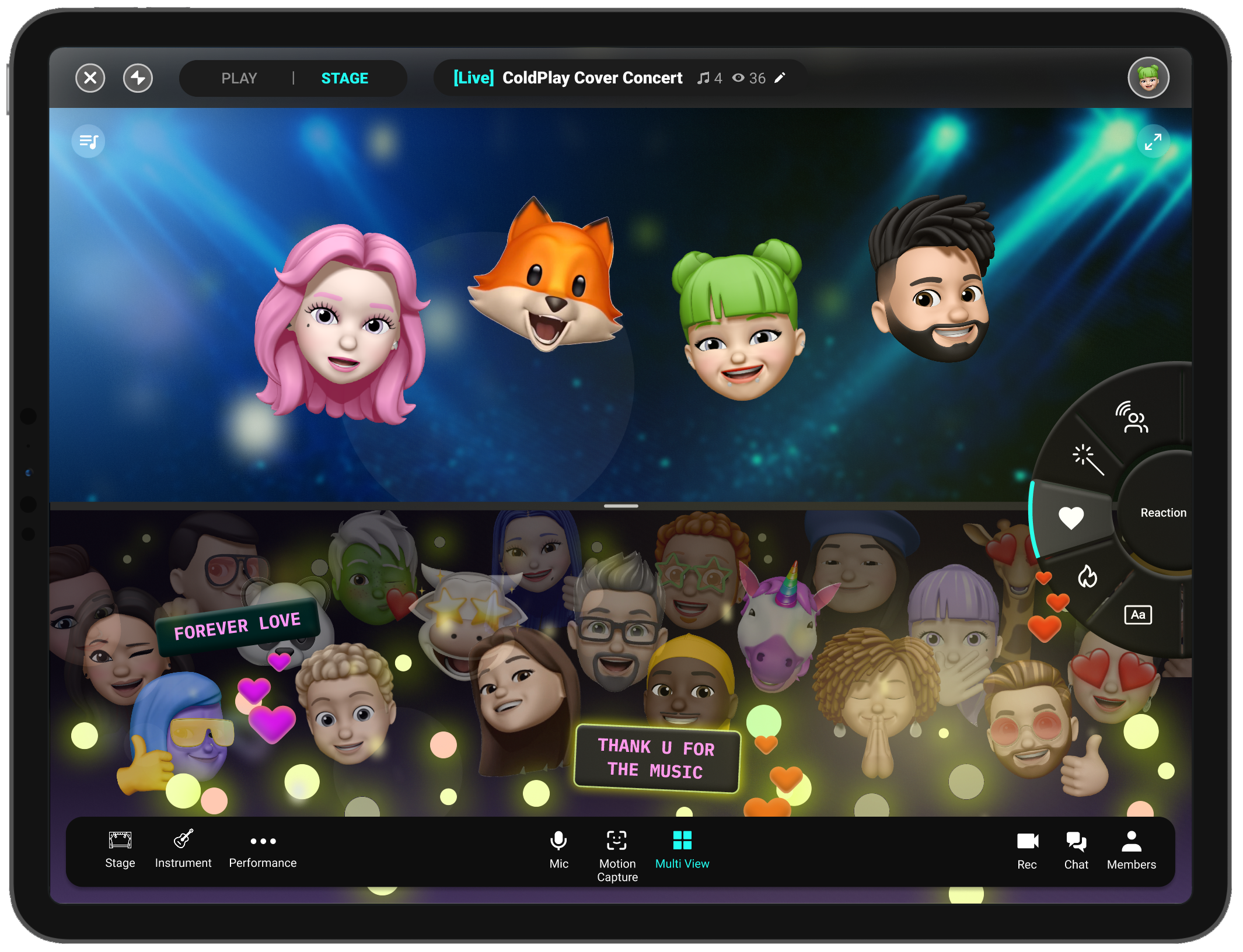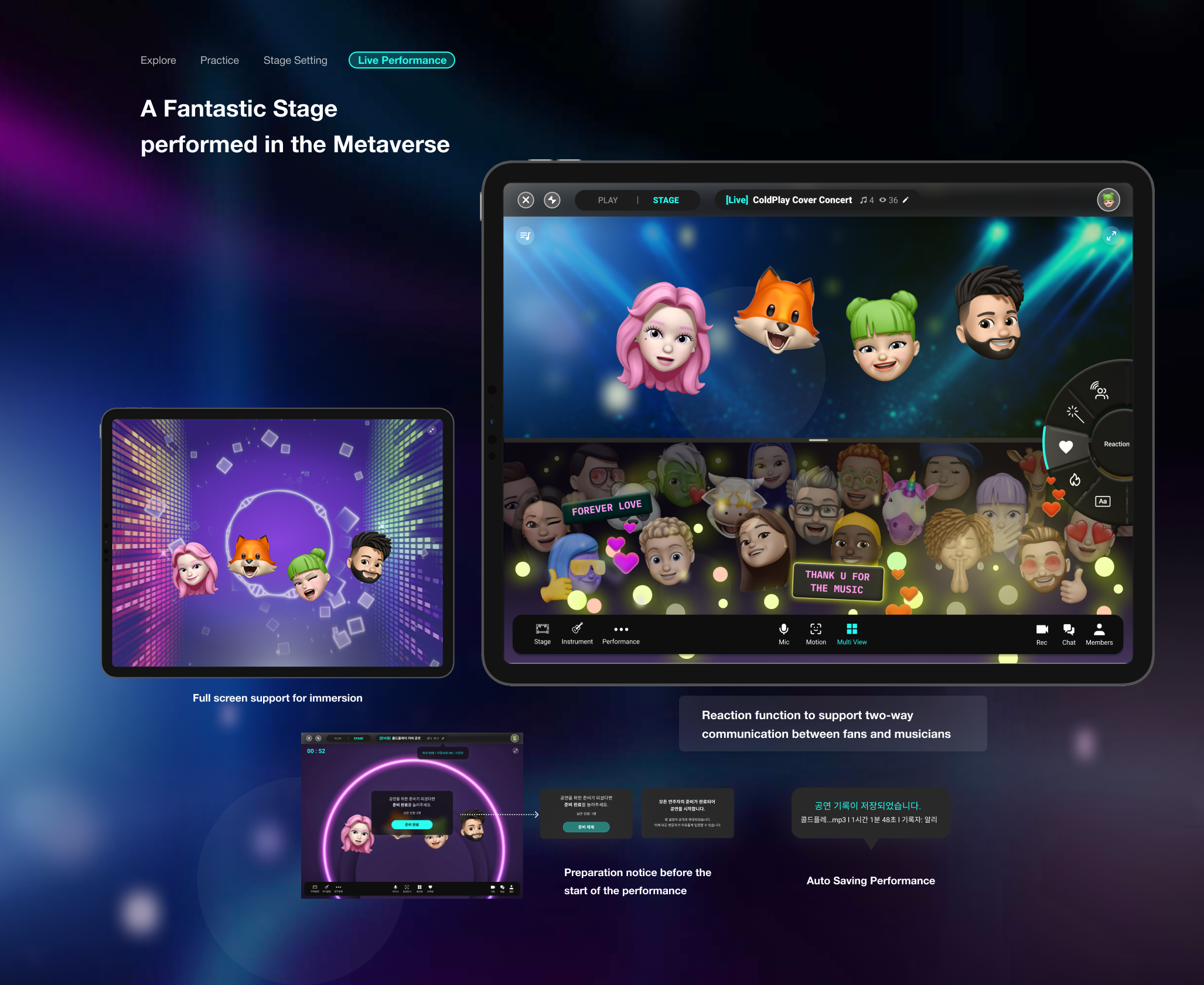 Free expression of individuality. Users can freely express their musical characteristics using Virtual characters. Musicians can also design the stage to their heart's content in the metaverse.