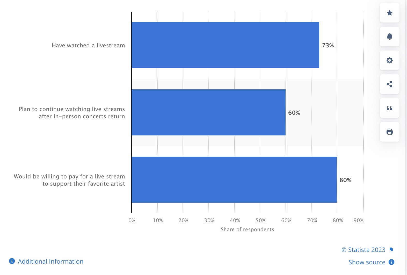 Livestreaming of concerts and other events were an alternative to in-person events during the coronavirus (COVID-19) pandemic. As of August 2020, 73 percent of music fans surveyed said they had watched a livestream, with 60 percent saying they would continue watching live streams even after in-person events returned. The majority of fans were also willing to support their favorite artist by paying for streams, giving tips, or buying merch.