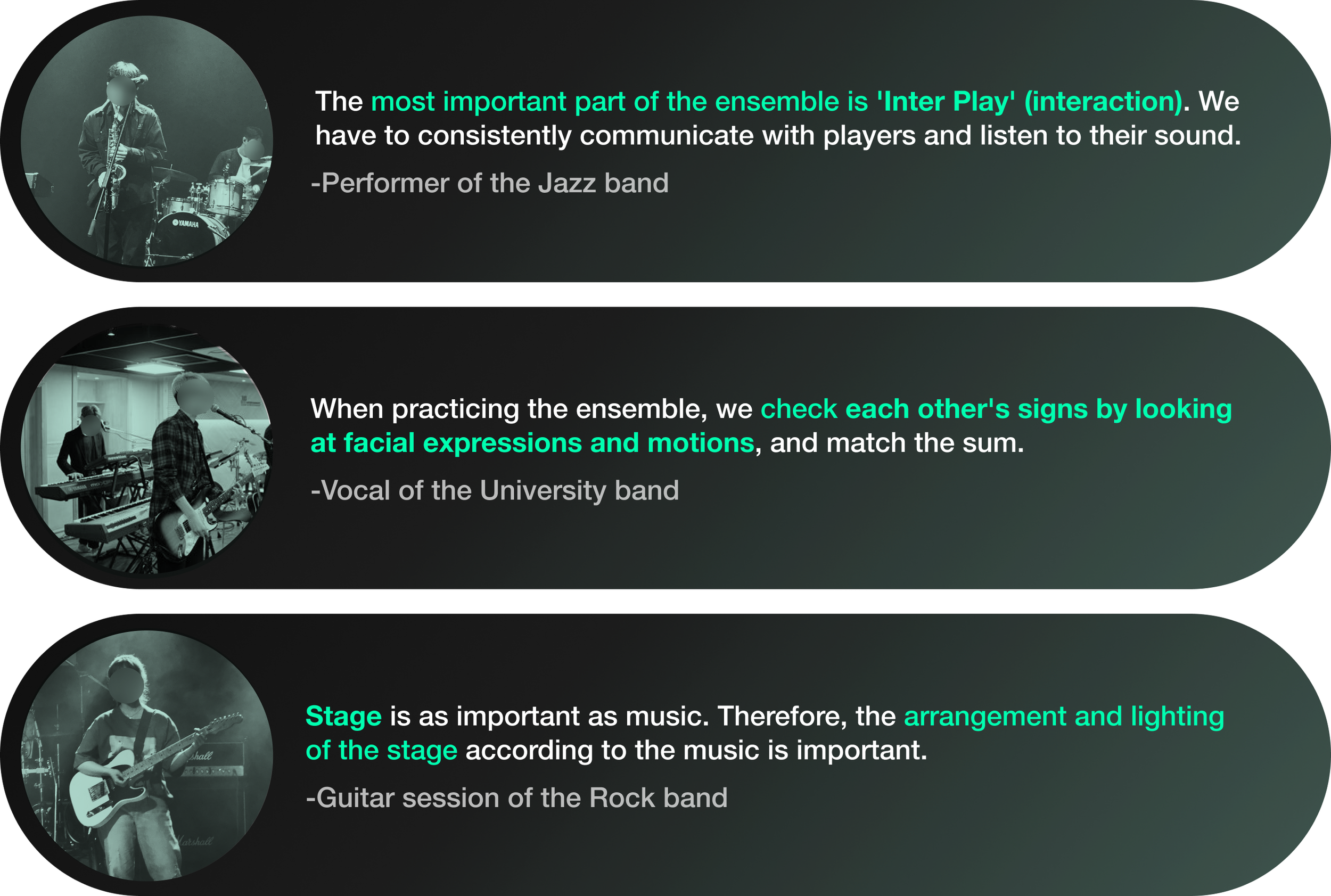 We conducted interviews with actual band players. After asking what elements they thought were essential in the ensemble process, I tried to implement them online.
